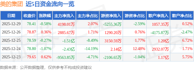 证券之星消息,截至2025年12月29日收盘,美的集团(000333)报收于78.41元,下跌0.58%,换手率0.38%,成交量25.7万手,成交额20.26亿元。
