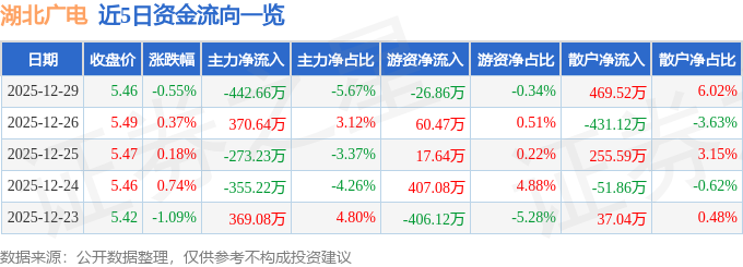 证券之星消息,截至2025年12月29日收盘,湖北广电(000665)报收于5.46元,下跌0.55%,换手率1.25%,成交量14.27万手,成交额7803.01万元。