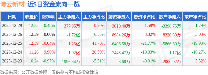 证券之星消息,截至2025年12月29日收盘,博云新材(002297)报收于12.33元,下跌0.48%,换手率26.46%,成交量151.65万手,成交额19.0亿元。