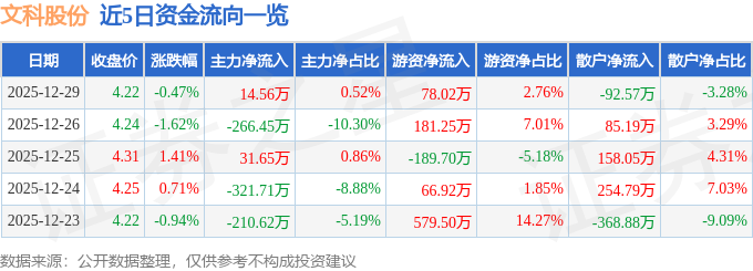 证券之星消息,截至2025年12月29日收盘,文科股份(002775)报收于4.22元,下跌0.47%,换手率1.42%,成交量6.7万手,成交额2824.05万元。