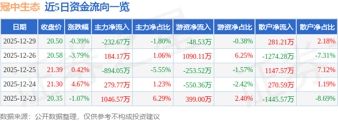 证券之星消息,截至2025年12月29日收盘,冠中生态(300948)报收于20.5元,下跌0.39%,换手率4.17%,成交量6.24万手,成交额1.29亿元。