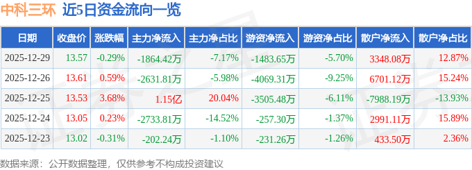 证券之星消息,截至2025年12月29日收盘,中科三环(000970)报收于13.57元,下跌0.29%,换手率1.57%,成交量19.08万手,成交额2.6亿元。
