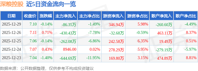 证券之星消息,截至2025年12月29日收盘,深粮控股(000019)报收于7.1元,下跌0.14%,换手率1.97%,成交量8.19万手,成交额5804.08万元。