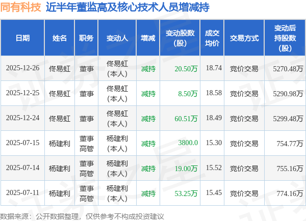同有科技近半年内的董监高及核心技术人员增减持详情如下: