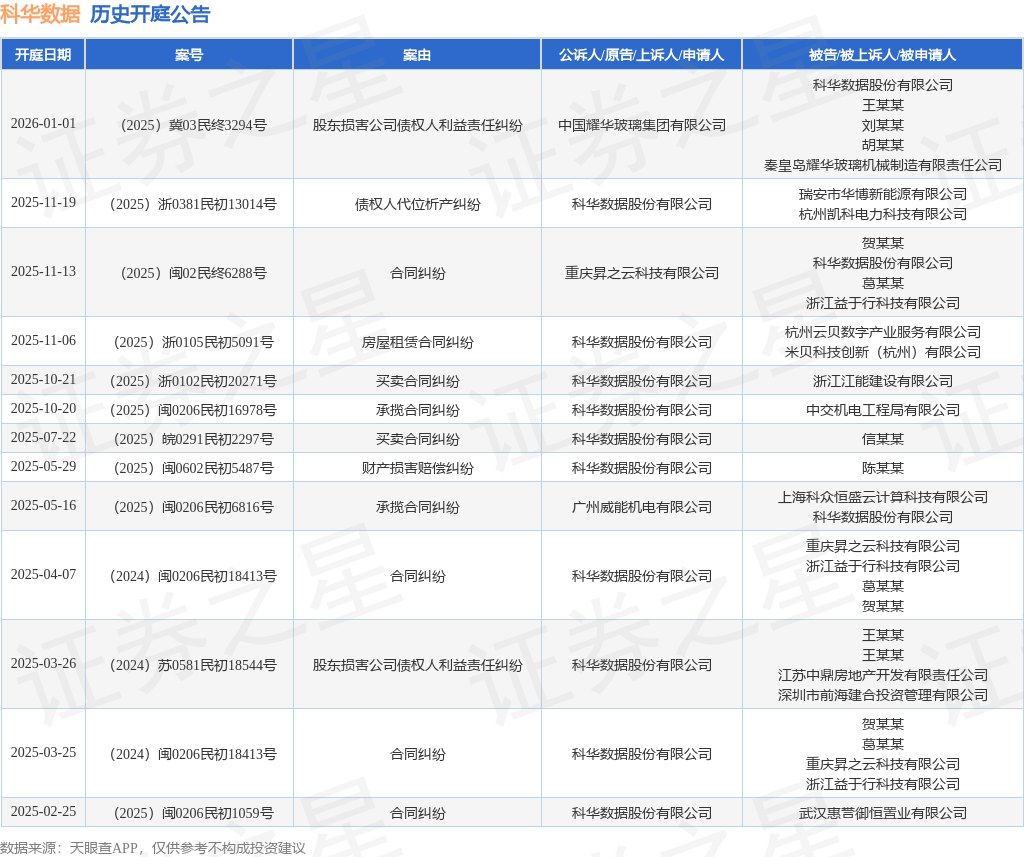 根据统计,近一年内以科华数据股份有限公司为当事人的历史开庭公告有13则,其中案由为“合同纠纷”的公告以4则居首,其次为“买卖合同纠纷”有2则,“承揽合同纠纷”有2则。历史开庭公告如下: