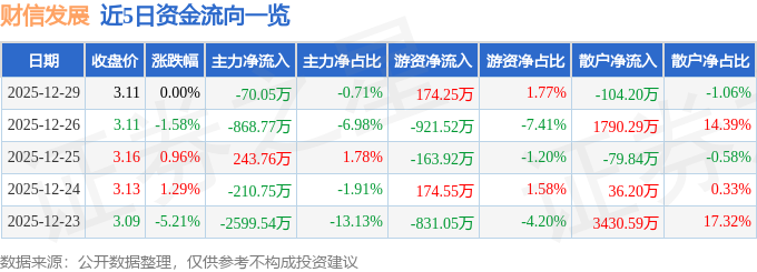 证券之星消息,截至2025年12月29日收盘,财信发展(000838)报收于3.11元,上涨0.0%,换手率2.98%,成交量31.42万手,成交额9838.36万元。