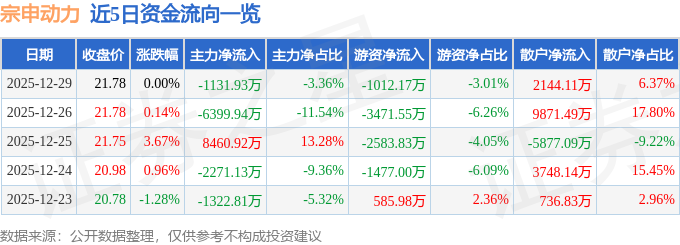 证券之星消息,截至2025年12月29日收盘,宗申动力(001696)报收于21.78元,上涨0.0%,换手率1.73%,成交量15.45万手,成交额3.37亿元。
