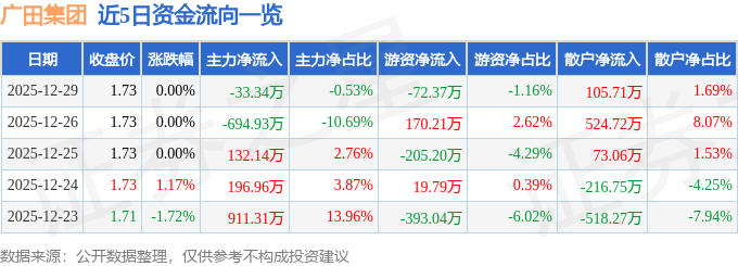 证券之星消息,截至2025年12月29日收盘,广田集团(002482)报收于1.73元,上涨0.0%,换手率0.97%,成交量36.18万手,成交额6245.87万元。