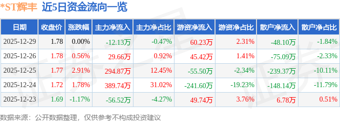 证券之星消息,截至2025年12月29日收盘,*ST辉丰(002496)报收于1.78元,上涨0.0%,换手率1.32%,成交量14.69万手,成交额2607.02万元。