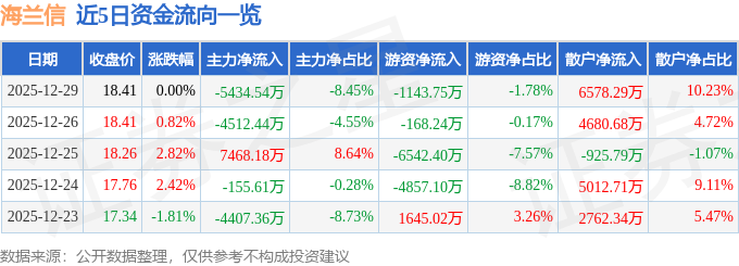 证券之星消息,截至2025年12月29日收盘,海兰信(300065)报收于18.41元,上涨0.0%,换手率5.3%,成交量34.79万手,成交额6.43亿元。
