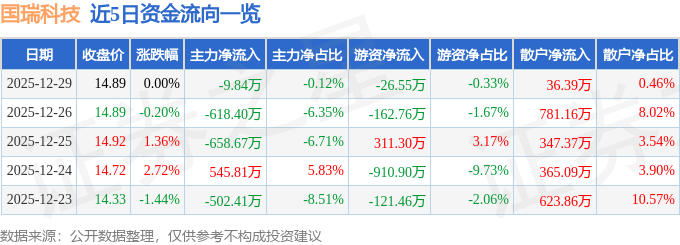 证券之星消息,截至2025年12月29日收盘,国瑞科技(300600)报收于14.89元,上涨0.0%,换手率1.82%,成交量5.36万手,成交额7984.63万元。