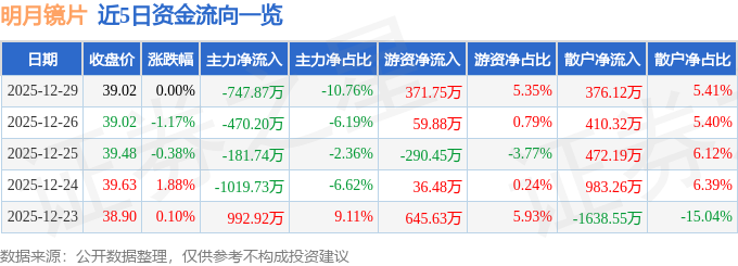 证券之星消息,截至2025年12月29日收盘,明月镜片(301101)报收于39.02元,上涨0.0%,换手率0.93%,成交量1.78万手,成交额6949.34万元。