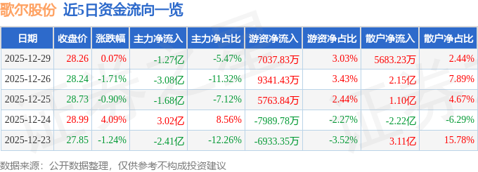 证券之星消息,截至2025年12月29日收盘,歌尔股份(002241)报收于28.26元,上涨0.07%,换手率2.61%,成交量81.97万手,成交额23.25亿元。