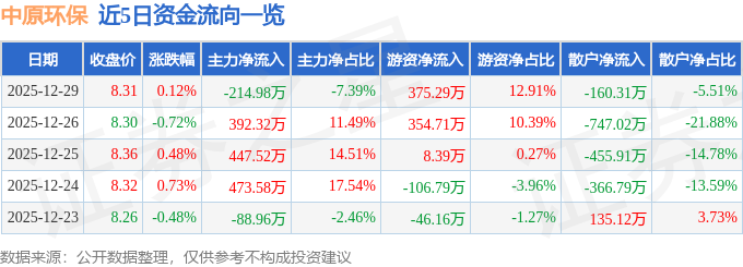 证券之星消息,截至2025年12月29日收盘,中原环保(000544)报收于8.31元,上涨0.12%,换手率0.36%,成交量3.5万手,成交额2907.79万元。