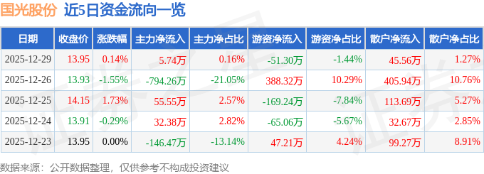 证券之星消息,截至2025年12月29日收盘,国光股份(002749)报收于13.95元,上涨0.14%,换手率0.56%,成交量2.56万手,成交额3573.73万元。