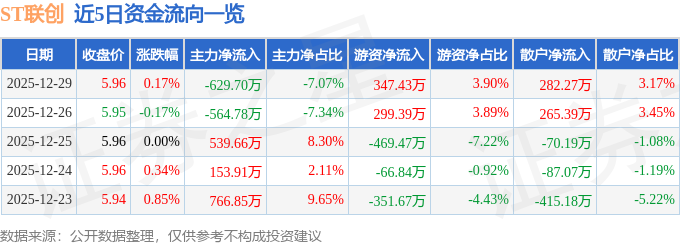 证券之星消息,截至2025年12月29日收盘,ST联创(300343)报收于5.96元,上涨0.17%,换手率1.4%,成交量14.97万手,成交额8902.52万元。