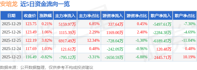 12月29日的资金流向数据方面,主力资金净流入5159.97万元,占总成交额6.85%,游资资金净流入337.64万元,占总成交额0.45%,散户资金净流出5497.61万元,占总成交额7.3%。
