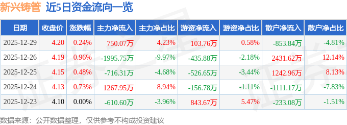 证券之星消息,截至2025年12月29日收盘,新兴铸管(000778)报收于4.2元,上涨0.24%,换手率1.09%,成交量42.33万手,成交额1.78亿元。