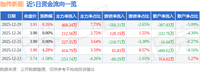 证券之星消息,截至2025年12月29日收盘,珈伟新能(300317)报收于3.91元,上涨0.26%,换手率1.87%,成交量15.51万手,成交额6054.5万元。