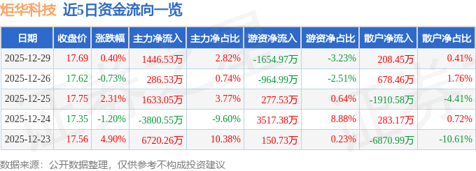 证券之星消息,截至2025年12月29日收盘,炬华科技(300360)报收于17.69元,上涨0.4%,换手率5.71%,成交量28.55万手,成交额5.13亿元。