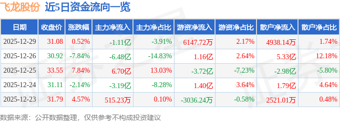 证券之星消息,截至2025年12月29日收盘,飞龙股份(002536)报收于31.08元,上涨0.52%,换手率16.65%,成交量90.63万手,成交额28.37亿元。