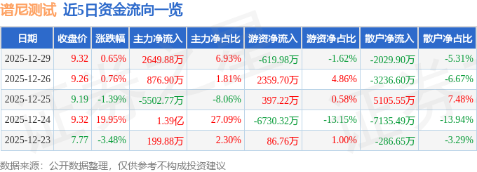 证券之星消息,截至2025年12月29日收盘,谱尼测试(300887)报收于9.32元,上涨0.65%,换手率11.33%,成交量41.05万手,成交额3.82亿元。