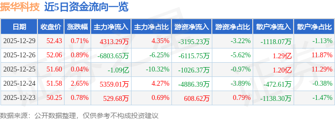 证券之星消息,截至2025年12月29日收盘,振华科技(000733)报收于52.43元,上涨0.71%,换手率3.41%,成交量18.9万手,成交额9.91亿元。