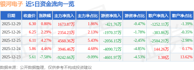 证券之星消息,截至2025年12月29日收盘,银河电子(002519)报收于6.3元,上涨0.8%,换手率12.84%,成交量143.69万手,成交额9.0亿元。