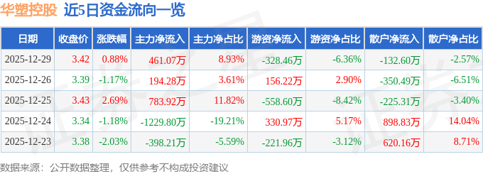 证券之星消息,截至2025年12月29日收盘,华塑控股(000509)报收于3.42元,上涨0.88%,换手率1.42%,成交量15.22万手,成交额5163.57万元。