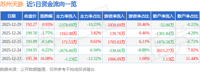 证券之星消息,截至2025年12月29日收盘,苏州天脉(301626)报收于192.27元,上涨0.93%,换手率2.29%,成交量1.21万手,成交额2.32亿元。