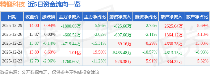 证券之星消息,截至2025年12月29日收盘,精锻科技(300258)报收于14.0元,上涨0.94%,换手率3.78%,成交量21.55万手,成交额3.02亿元。