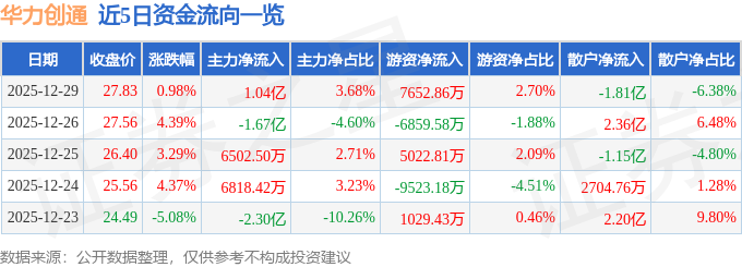 证券之星消息,截至2025年12月29日收盘,华力创通(300045)报收于27.83元,上涨0.98%,换手率19.77%,成交量102.07万手,成交额28.31亿元。