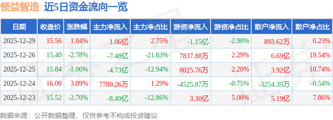 证券之星消息,截至2025年12月29日收盘,领益智造(002600)报收于15.56元,上涨1.04%,换手率3.41%,成交量245.4万手,成交额38.54亿元。