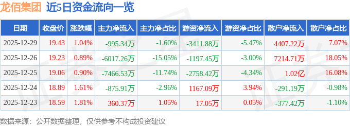证券之星消息,截至2025年12月29日收盘,龙佰集团(002601)报收于19.43元,上涨1.04%,换手率1.6%,成交量31.89万手,成交额6.23亿元。