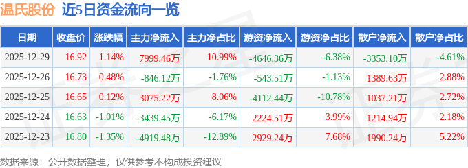 证券之星消息,截至2025年12月29日收盘,温氏股份(300498)报收于16.92元,上涨1.14%,换手率0.72%,成交量42.9万手,成交额7.28亿元。