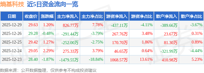 证券之星消息,截至2025年12月29日收盘,熵基科技(301330)报收于29.63元,上涨1.2%,换手率3.13%,成交量3.57万手,成交额1.06亿元。
