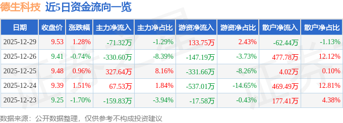 证券之星消息,截至2025年12月29日收盘,德生科技(002908)报收于9.53元,上涨1.28%,换手率1.81%,成交量5.82万手,成交额5508.68万元。