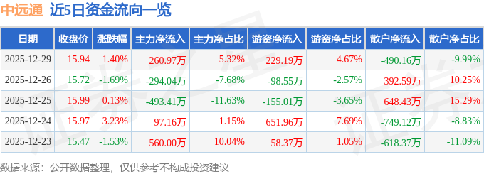 证券之星消息,截至2025年12月29日收盘,中远通(301516)报收于15.94元,上涨1.4%,换手率4.4%,成交量3.09万手,成交额4904.45万元。
