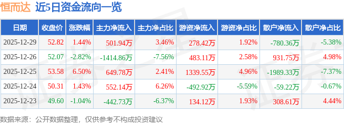 证券之星消息,截至2025年12月29日收盘,恒而达(300946)报收于52.82元,上涨1.44%,换手率3.64%,成交量2.76万手,成交额1.45亿元。
