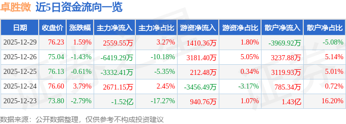 证券之星消息,截至2025年12月29日收盘,卓胜微(300782)报收于76.23元,上涨1.59%,换手率2.28%,成交量10.23万手,成交额7.82亿元。