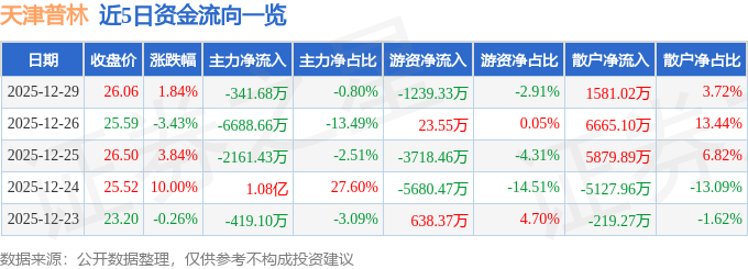 证券之星消息,截至2025年12月29日收盘,天津普林(002134)报收于26.06元,上涨1.84%,换手率6.6%,成交量16.22万手,成交额4.25亿元。