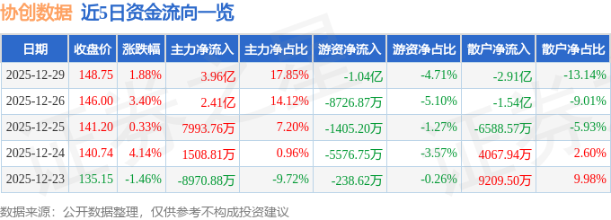 证券之星消息,截至2025年12月29日收盘,协创数据(300857)报收于148.75元,上涨1.88%,换手率4.31%,成交量14.89万手,成交额22.17亿元。