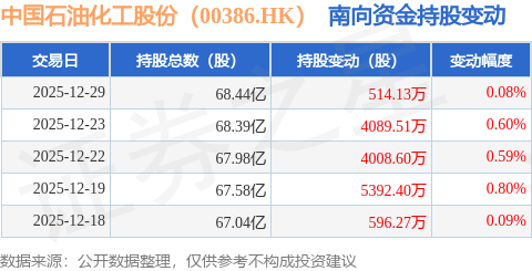 证券之星消息,12月29日南向资金增持514.13万股中国石油化工股份(00386.HK)。近5个交易日中,获南向资金增持的有5天,累计净增持1.46亿股。近20个交易日中,获南向资金增持的有13天,累计净增持2.08亿股。截至目前,南向资金持有中国石油化工股份(00386.HK)68.44亿股,占公司已发行普通股的28.57%。