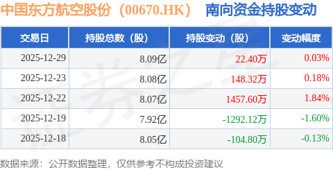 证券之星消息,12月29日南向资金增持22.4万股中国东方航空股份(00670.HK)。近5个交易日中,获南向资金增持的有3天,累计净增持231.4万股。近20个交易日中,获南向资金增持的有13天,累计净增持2544.0万股。截至目前,南向资金持有中国东方航空股份(00670.HK)8.09亿股,占公司已发行普通股的15.96%。