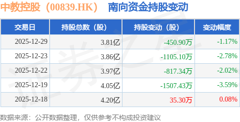 证券之星消息,12月29日南向资金减持450.9万股中教控股(00839.HK)。近5个交易日中,获南向资金减持的有4天,累计净减持3845.47万股。近20个交易日中,获南向资金减持的有16天,累计净减持6691.58万股。截至目前,南向资金持有中教控股(00839.HK)3.81亿股,占公司已发行普通股的13.6%。