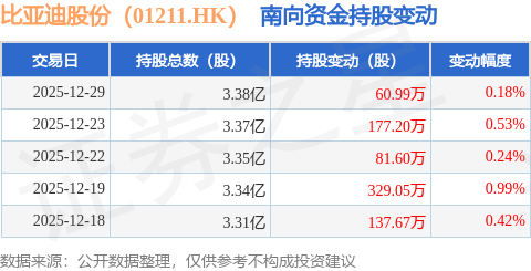 证券之星消息,12月29日南向资金增持60.99万股比亚迪股份(01211.HK)。近5个交易日中,获南向资金增持的有5天,累计净增持786.51万股。近20个交易日中,获南向资金增持的有19天,累计净增持2646.71万股。截至目前,南向资金持有比亚迪股份(01211.HK)3.38亿股,占公司已发行普通股的9.15%。