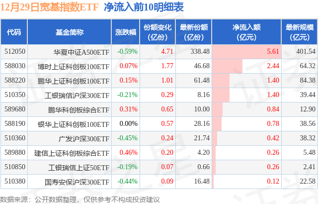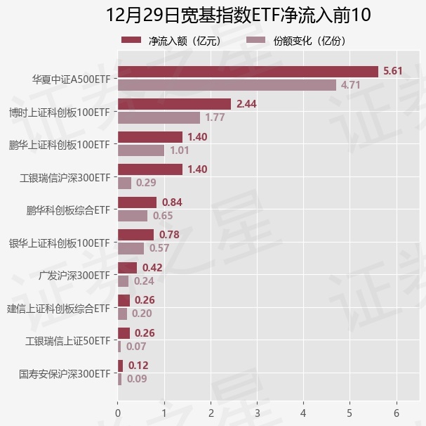 当日有20只宽基指数ETF基金出现资金净流入,其中净流入排首位的是华夏中证A500ETF(512050),份额增加了4.71亿份,净流入额为5.61亿元。