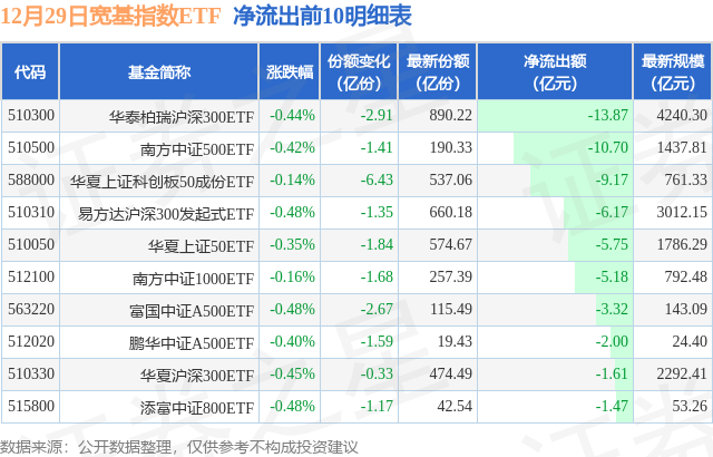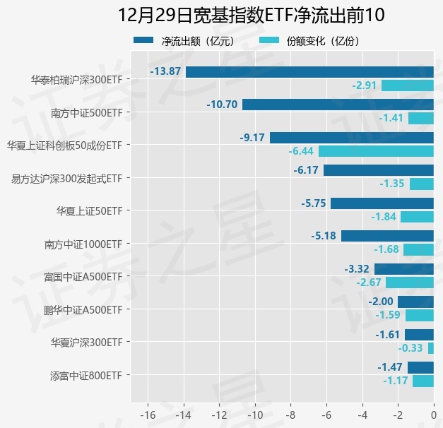 当日有105只宽基指数ETF基金出现资金净流出,其中净流出排首位的是华泰柏瑞沪深300ETF(510300),份额减少了2.91亿份,净流出额为13.87亿元。
