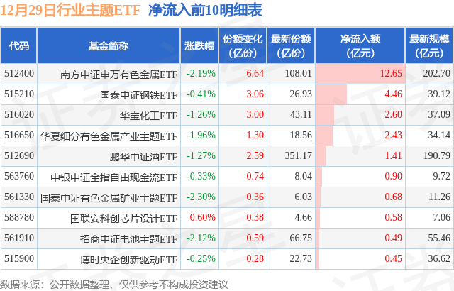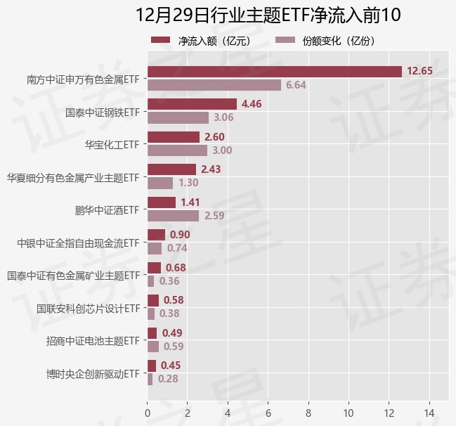 当日有65只行业主题ETF基金出现资金净流入,其中净流入排首位的是南方中证申万有色金属ETF(512400),份额增加了6.64亿份,净流入额为12.65亿元。