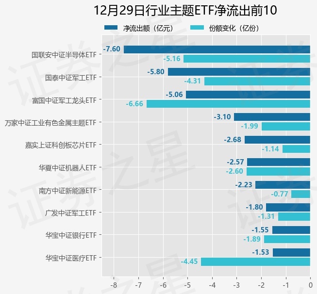 证券之星消息,12月29日行业主题ETF基金合计资金净流出25.98亿元,近5个交易日累计净流出122.1亿元,5个交易日中出现日合计资金净流出的有5天(ETF资金流向计算公式:(当日ETF场内流通份额-前一交易日ETF场内流通份额)*当日ETF均价,计算结果仅供参考)。